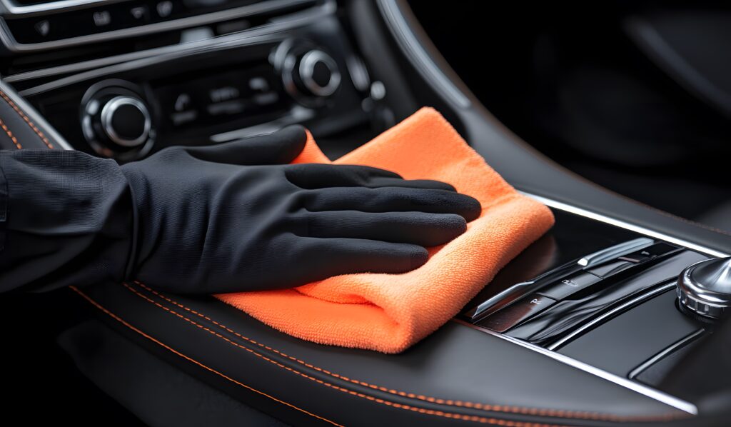 - In selective focus of human hand with microfiber cloth cleaning interior car,auto detailing and valeting concept,washing car care interior,blurry light background.