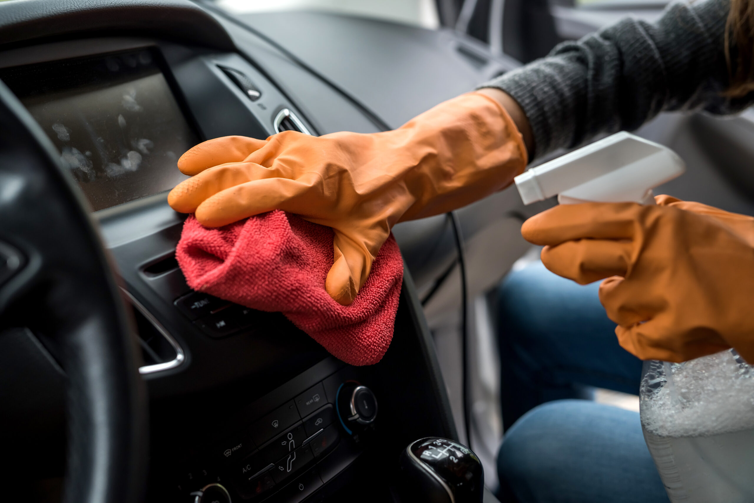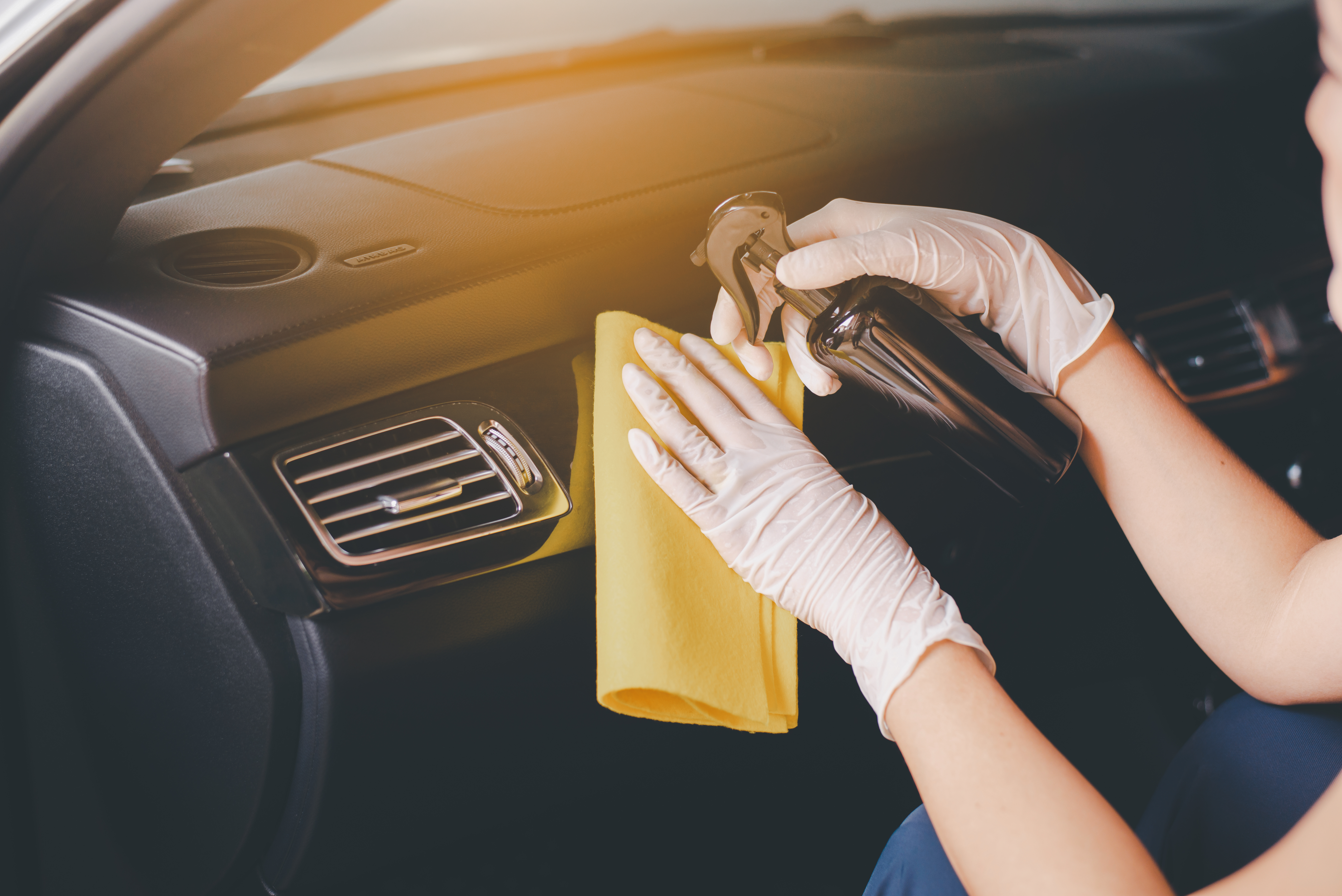 - worker hand wear glove cleaning car interior for prevention covid-19. conept of hygiene