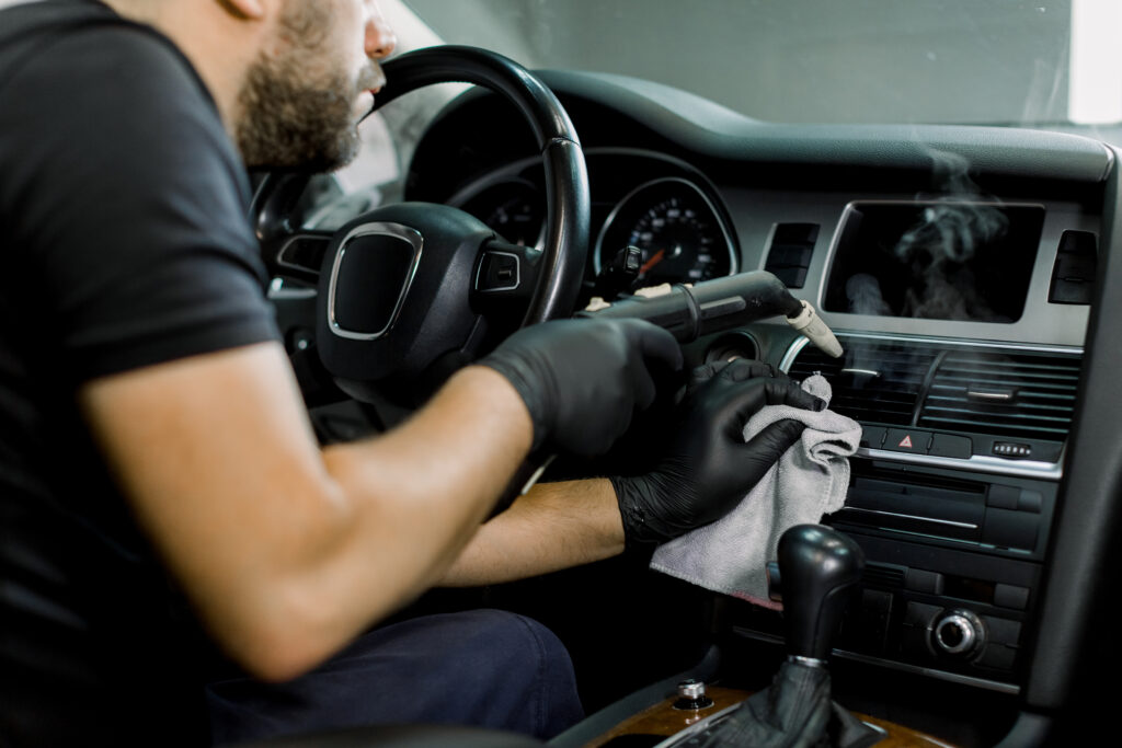 - Cropped close up image of male worker in black protective gloves, cleaning car interior and air conditioner with hot steam cleaner. Car detailing, steam cleaning concept.