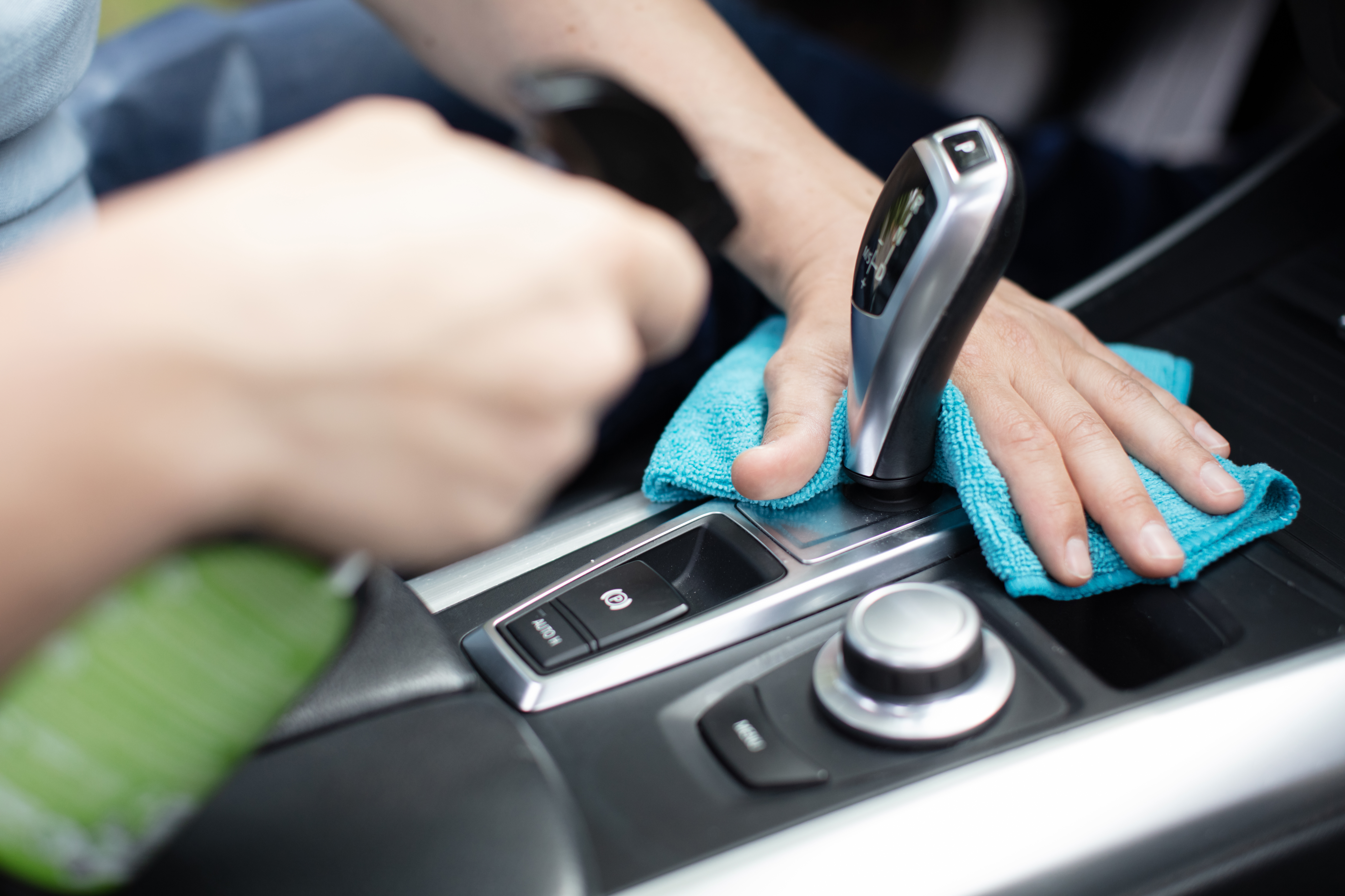 - hands dust around the gearstick of an automatic car